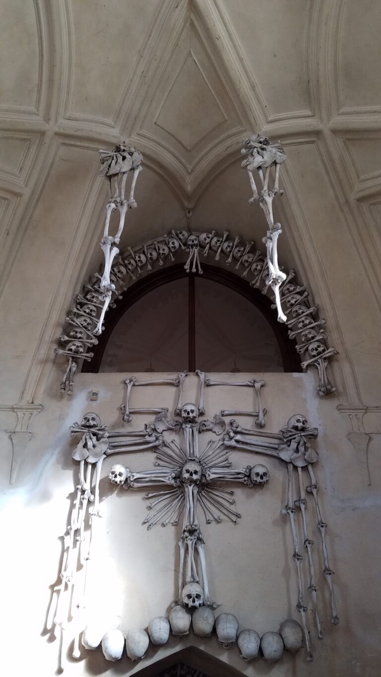“The Bone Church” or the Sedlec Ossuary is at the site of a former Abbey in Kutná Hora, Czech Republic, a 50-minute train ride from Prague. Train tickets from Prague are cheap and there is a local bus that travels from the train station to the church and through the rest of the city.